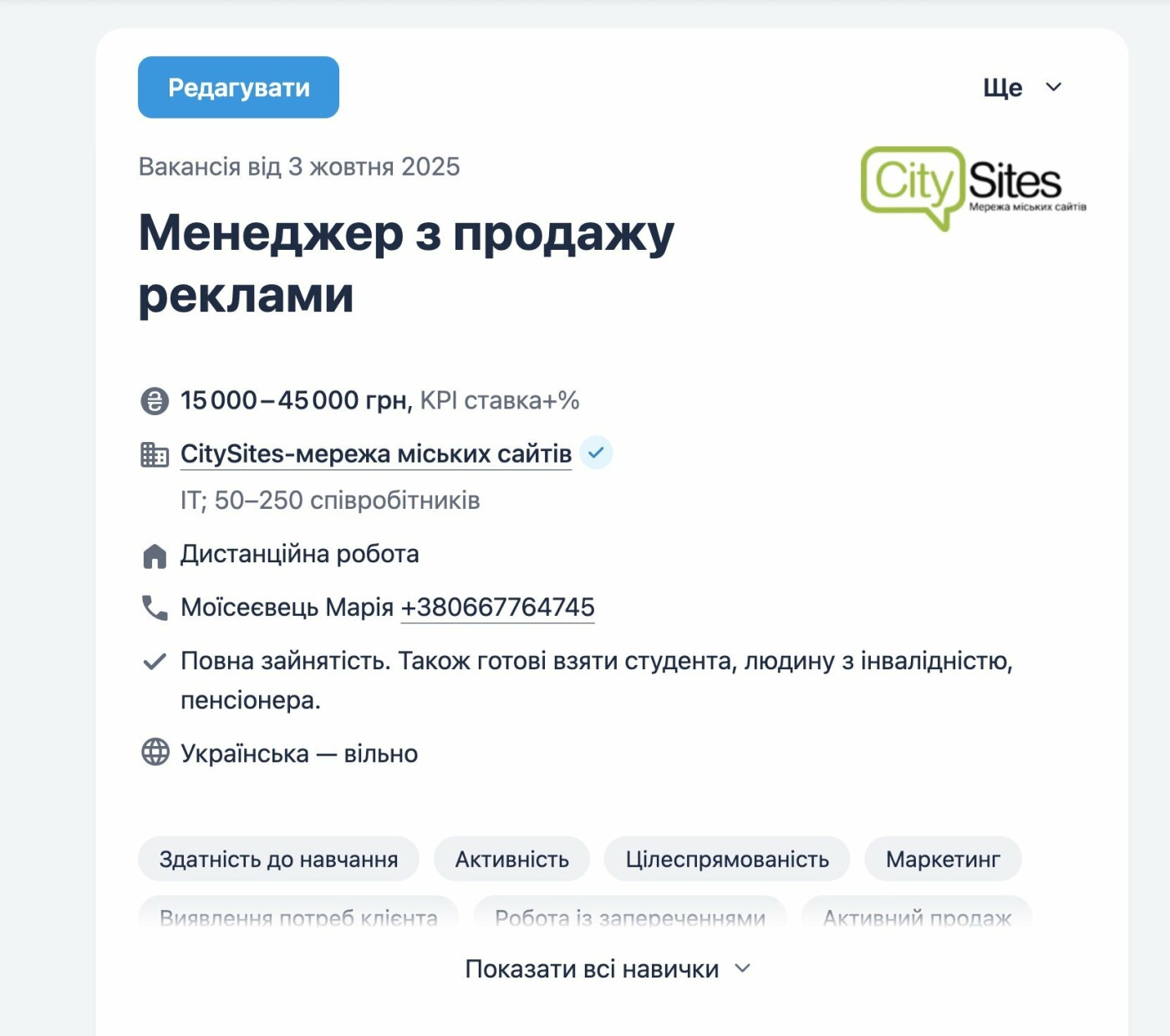 Ми шукаємо амбітного та цілеспрямованого Менеджера з продажу реклами. Ваша місія збільшення продажів реклами компанії CitySites через активні Холодні продажі.