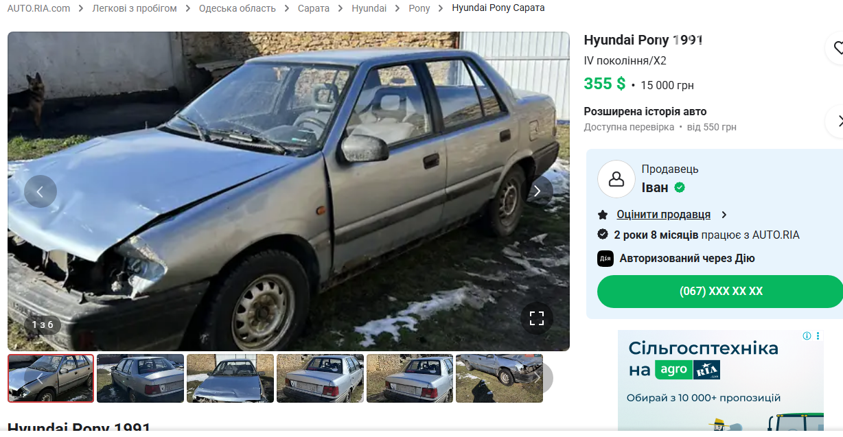 Цей Hyundai Pony 1991 року з 1.5-літровим бензиновим мотором та “механікою” єдиний у добірці, що фігурує після дорожньо-транспортної пригоди. Автомобіль отримав удар по передній частині, але виглядає так, що його можна бюджетно відновити, оскільки, за словами продавця, “двигун в порядку, колеса нові”. Стандартні проблеми старих кузовів, як-от іржа, нерівності та втрачені елементи, присутні. Продавець вказав на необхідність замінити капот, фари та радіатор.