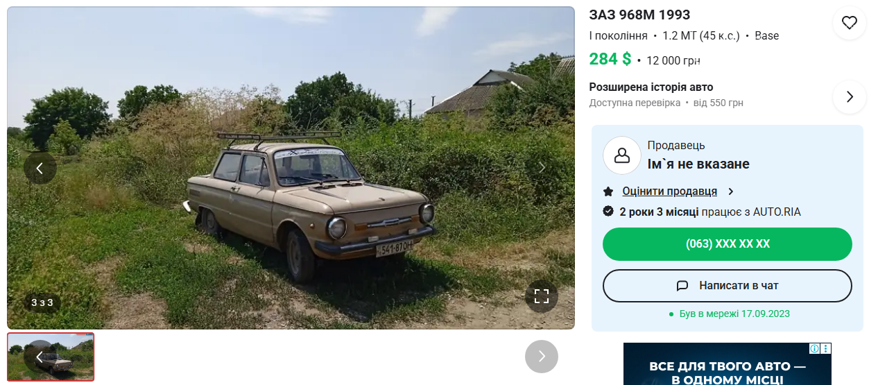 Продавець чесно зазначає: “На ходу, заводиться ключем, акумулятор новий, гума ще походить”, але при цьому додає, що “кузов треба варити днище та пороги, магнітола потребує ремонту”.