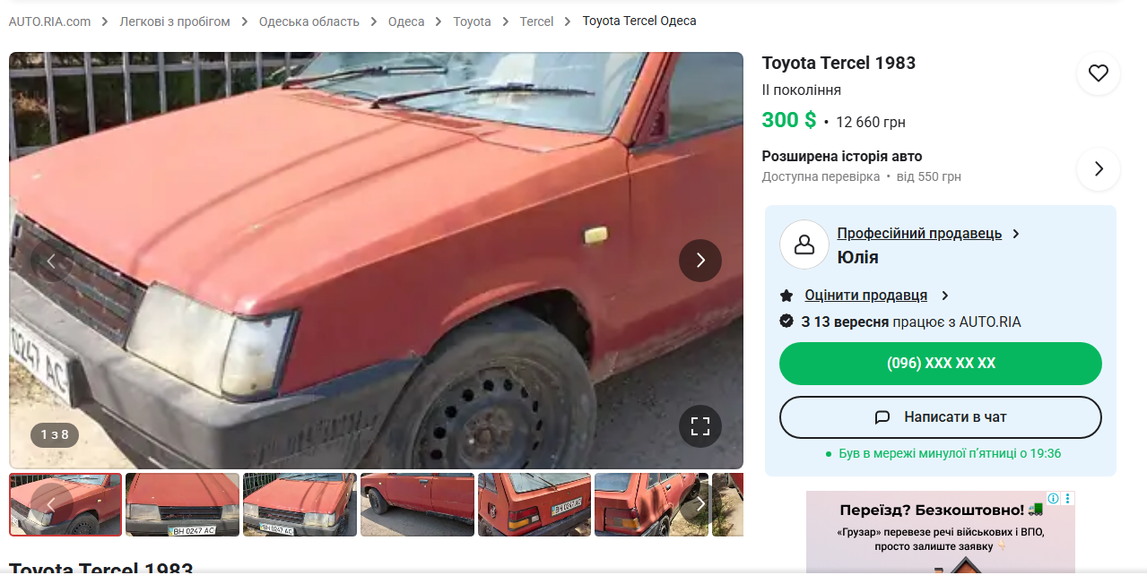 Вже рідкісний для наших доріг праворульний автомобіль Toyota Tercel 1983 року, оснащений півторалітровим бензиновим двигуном та “механікою”, виглядає відповідно до своєї ціни. На фото помітні значні проблеми з лакофарбовим покриттям, відсутність багатьох декоративних елементів, а кришка бензобака замінена ганчіркою. Стан фар також викликає питання, однак видимих дір у кузові немає, а салон, хоч і погано видно, є в наявності.