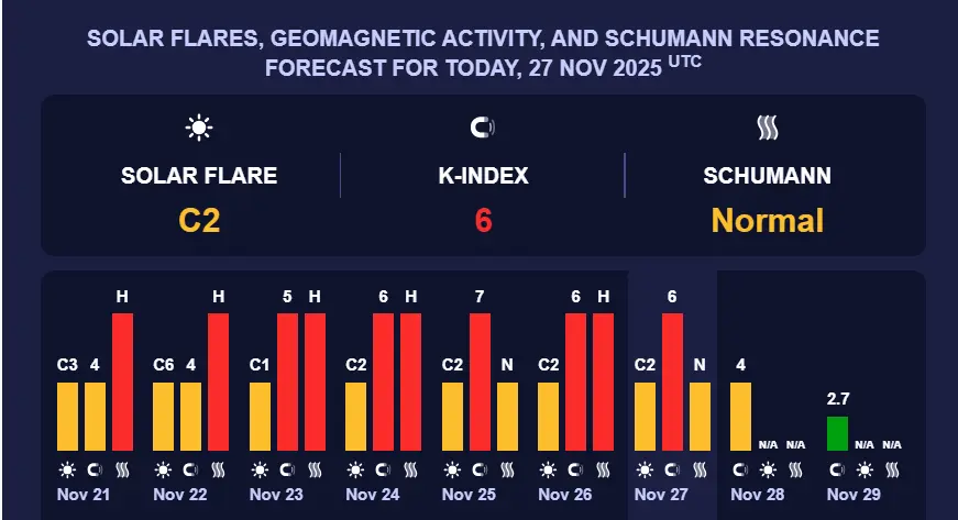 По данным официальных центров мониторинга космической погоды, включая NOAA Space Weather Prediction Center, 28 ноября 2025 года ожидается стабильная геомагнитная ситуация. Магнитосфера Земли будет находиться в диапазоне «средне возмущенного», что соответствует Kp-индексу 4. Такой уровень считается безопасным для большинства людей, но может отразиться на самочувствии метеочувствительных людей.