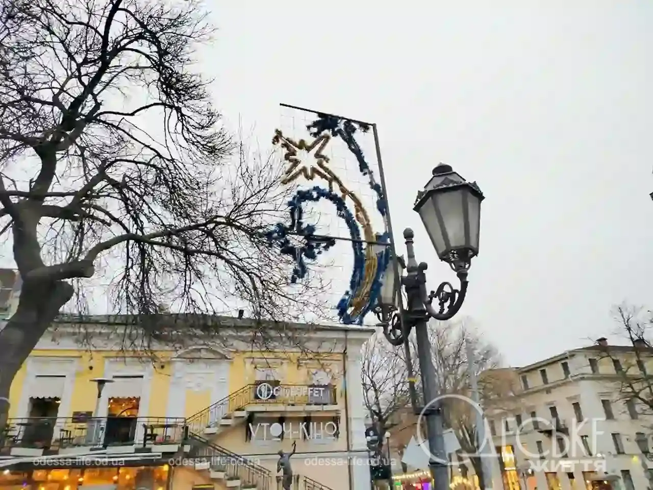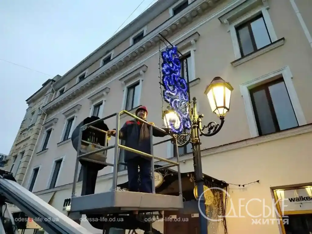 В Одессе началось праздничное оформление: на центральных улицах монтируют гирлянды, снежинки, звёзды, декоративные арки и другие новогодние инсталляции.