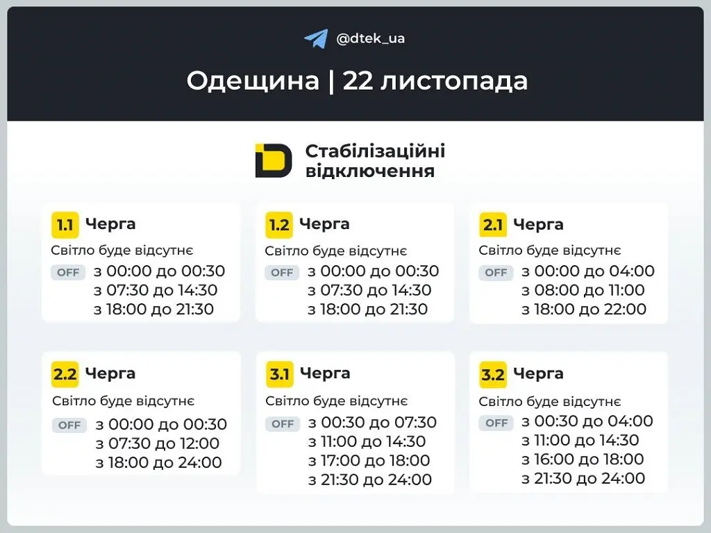 По обновленным данным ДТЭК, графики стабилизационных отключений света в Одессе и области завтра будут такими: